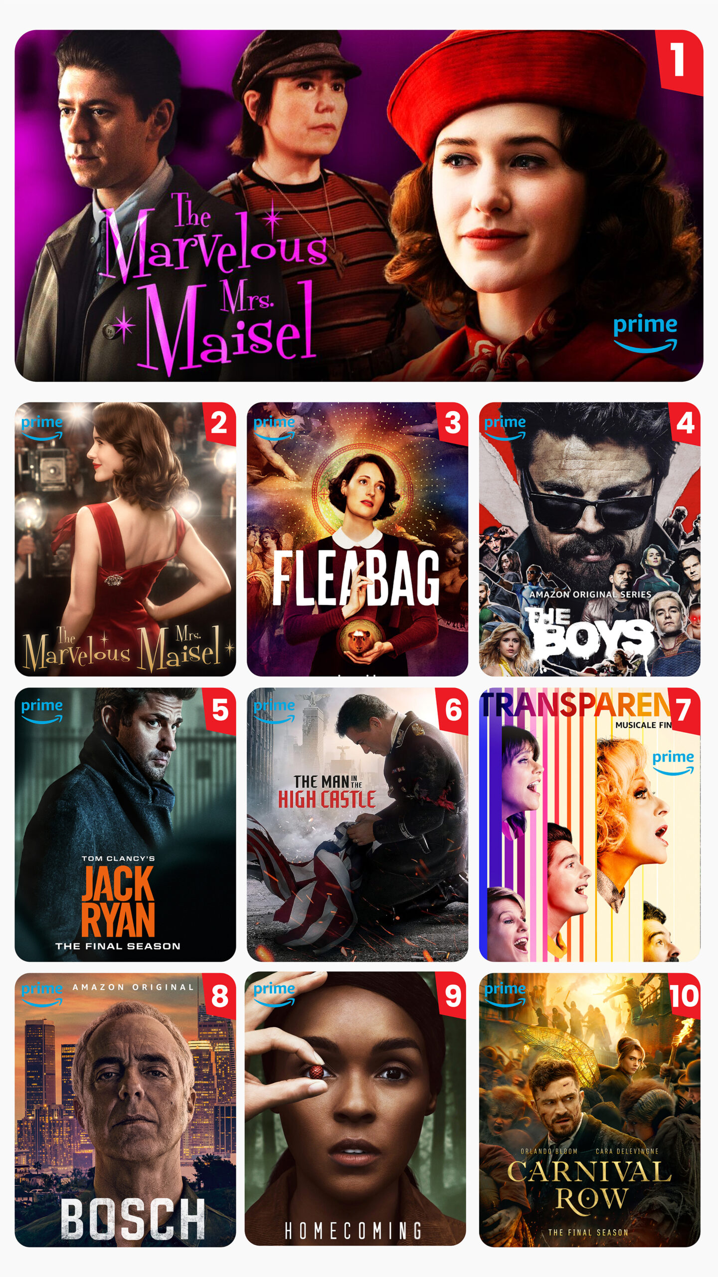 1950s housewife pursues stand-up comedy. Witty, vibrant, and critically acclaimed.